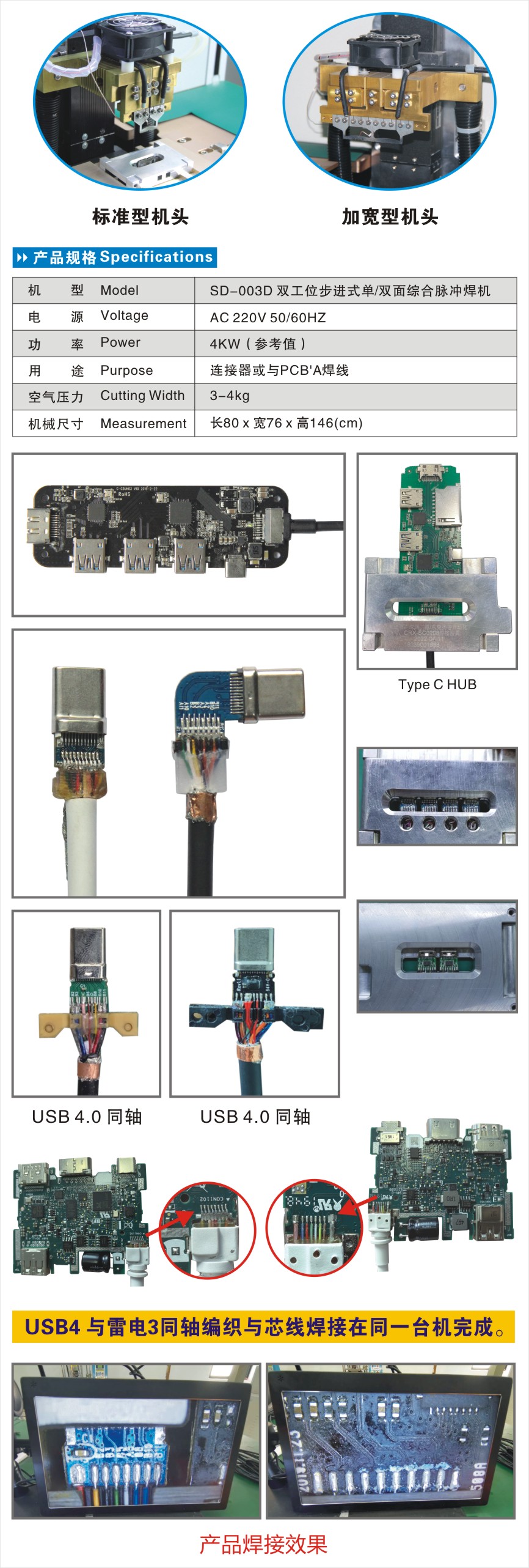 1、HDMI A 、C、D TYPE,Displayport, Mini Displaypor,USB C Type焊接和各類型PCB'A焊線等,效率高。(兩排同時(shí)焊,一次完成)